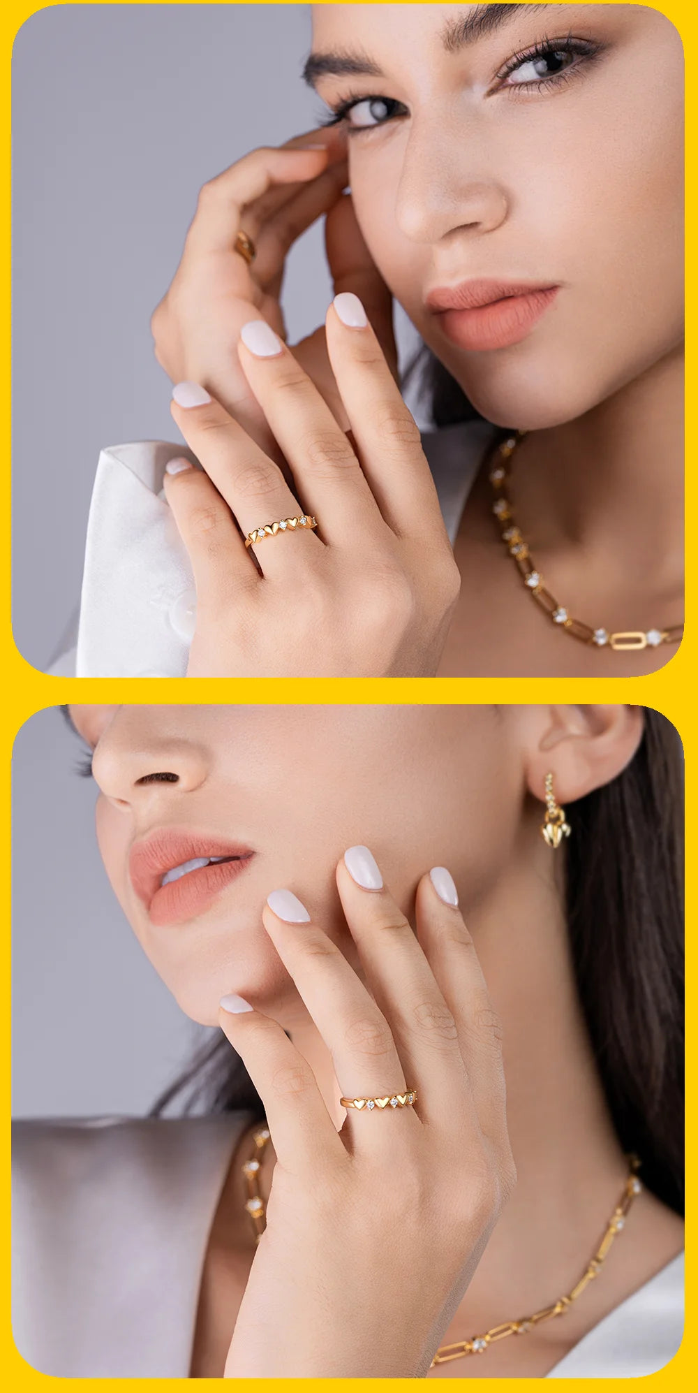 O design romântico deste anel, com corações polidos e moissanites reforçados, torna-o perfeito para aniversários, casamentos ou como um presente especial que simboliza carinho e devoção.