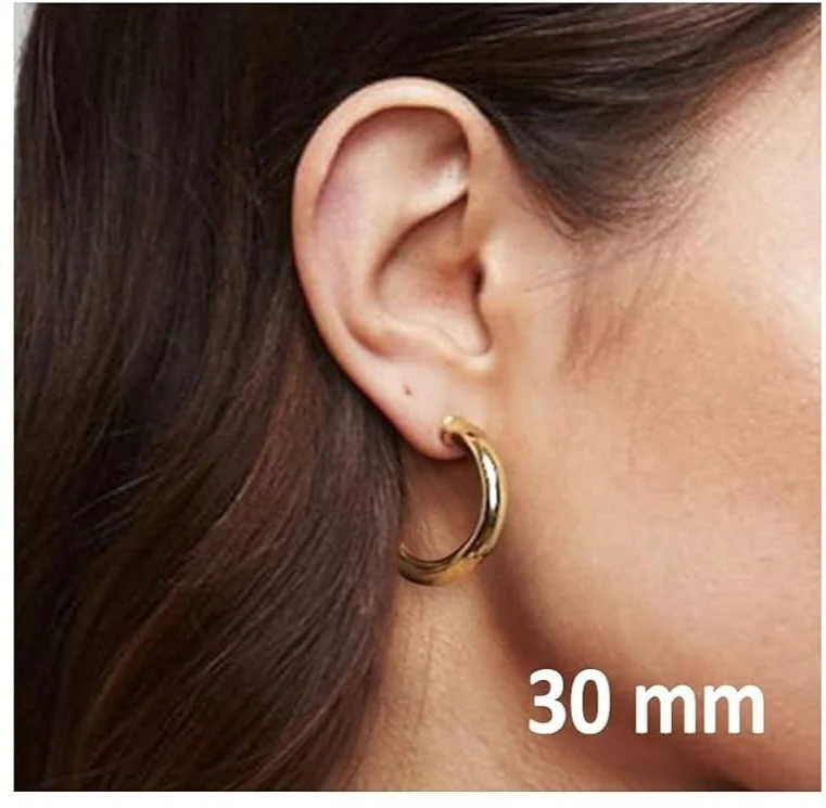 Os brincos são banhados a ouro 14K, disponíveis nas opções de ouro e prata, com tamanhos que variam entre 20mm e 30mm de diâmetro, adaptando-se perfeitamente ao seu estilo pessoal.