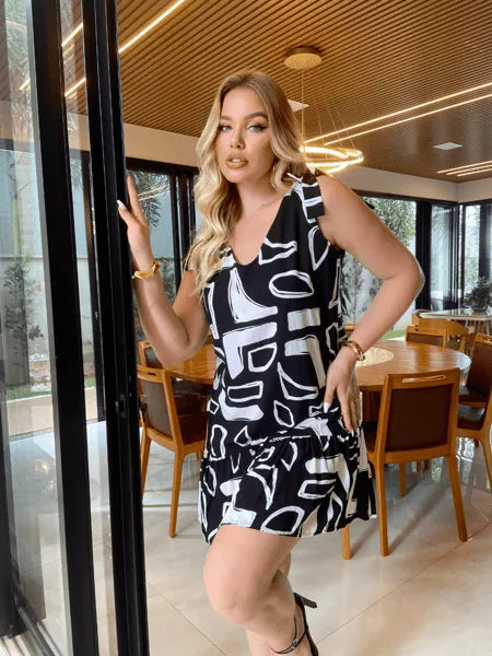 Com sua estampa única e o detalhe charmoso do laço na manga regata, este vestido é a escolha perfeita para quem quer se destacar e compor looks que não passam despercebidos.